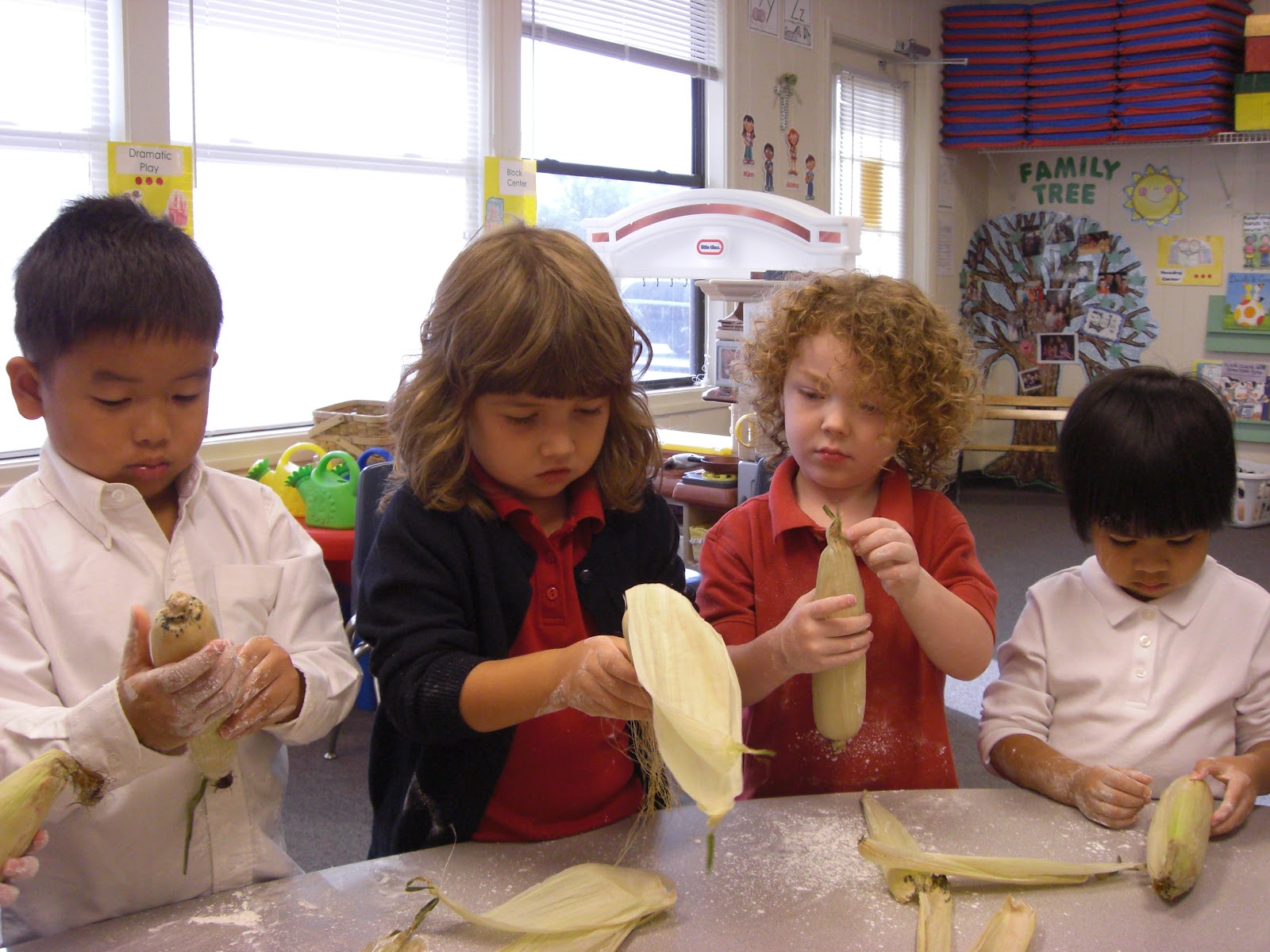 I thought you would all enjoy these pictures from Farm Week. As you can see, the kids were working hard to shuck corn. Prior to this we talked about all of the things that come from corn (corn oil, popcorn, corn meal, etc.) and we also got to touch some of these things. So some of us got a little bit covered in corn starch! The bottom picture is after we finger painted with chocolate pudding to make muddy pigs. All in all it was a great week in Preschool.
